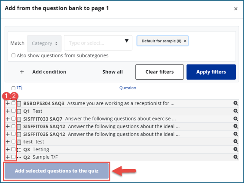 To add a question from the question bank, click the + icon next to an individual question to add it to the quiz. (1 in screenshot below)