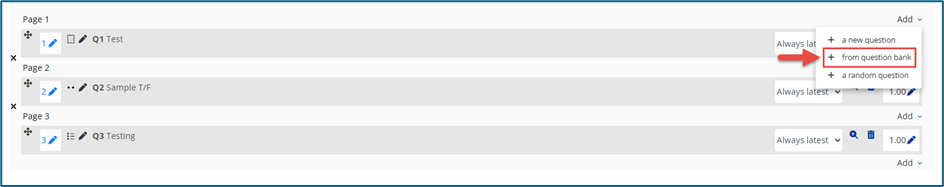 1. From question bank - If questions have already been created by other teachers or administrators in the course or from previous quizzes, you can reuse them by selecting + from question bank.