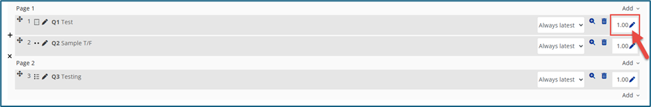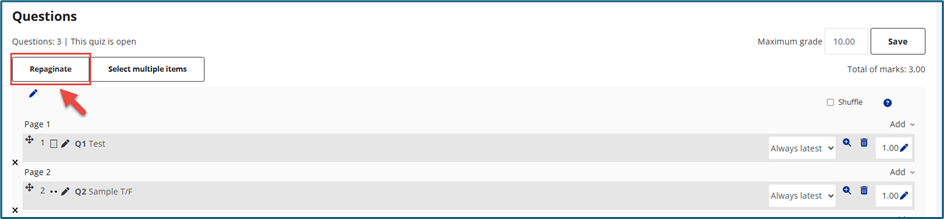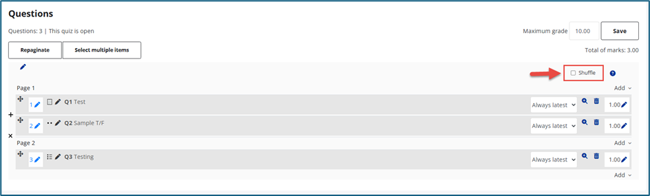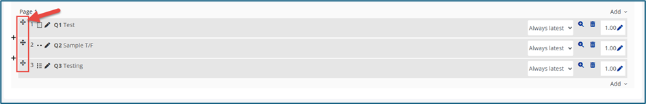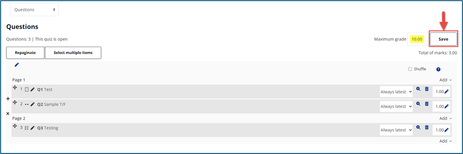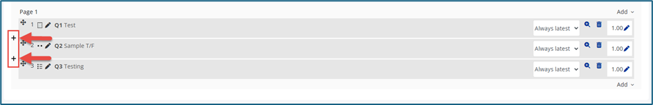 To add multiple questions, tick the checkbox beside each question (or the top checkbox to select all - 2 in screenshot below), then click Add selected questions to the quiz.