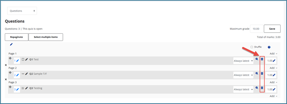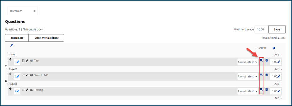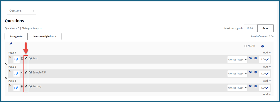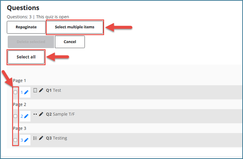The question bank will display all available quiz questions for the course.