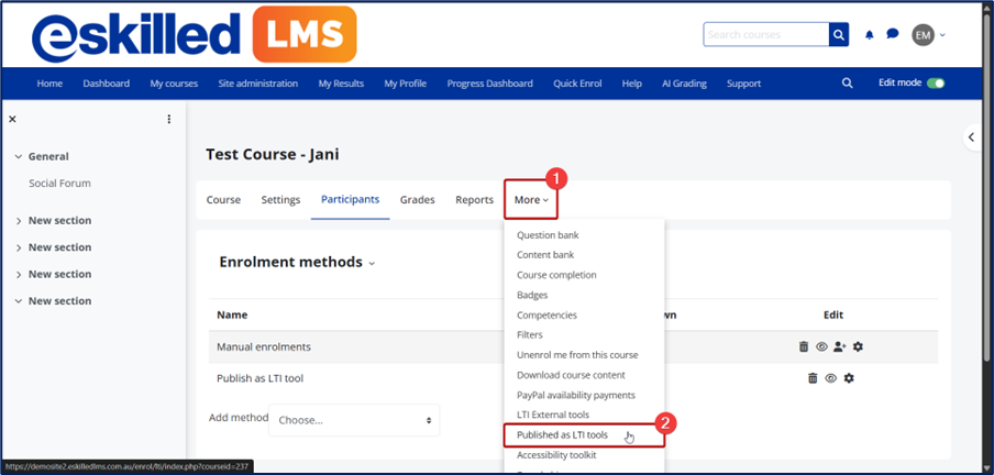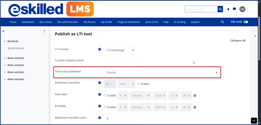 This guide explains how to publish a course activity as an LTI tool using Moodle. LTI (Learning Tools Interoperability) allows learners on a different system (known as an LTI consumer) to access selected activities, with grades sent back to the consumer site.
