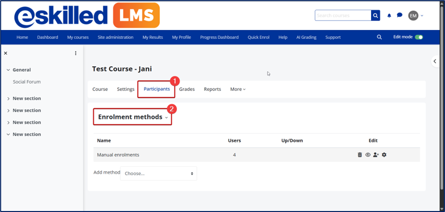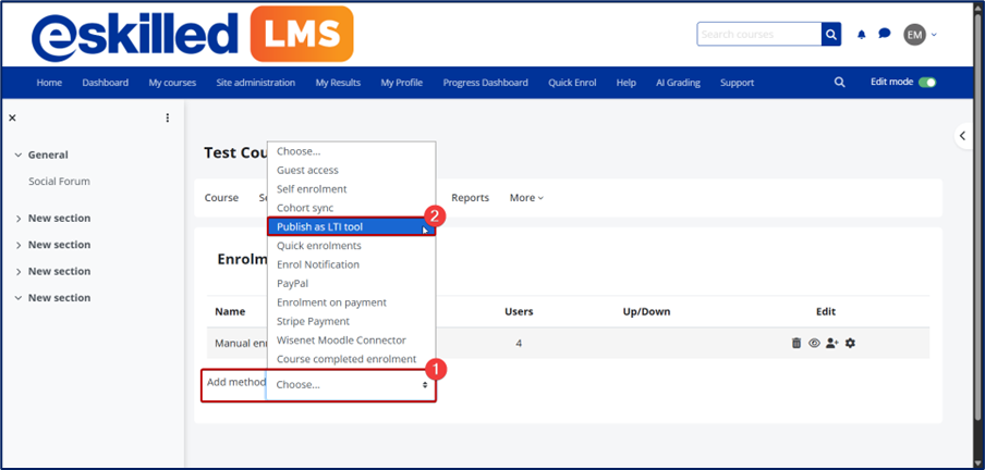 2. Click 'Add method' and choose 'Publish as LTI tool' as an enrolment method.