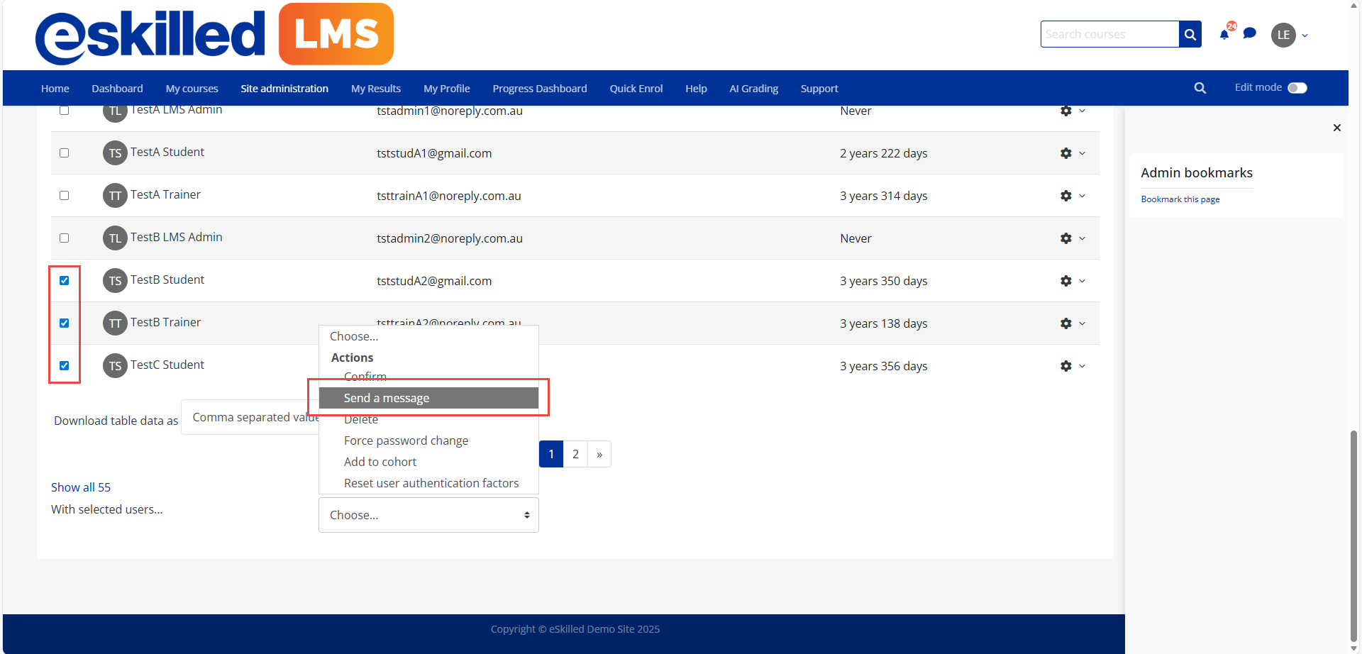 Option 2: Using Site Administration → Users → Browse List of Users, selecting one or multiple users, and sending a message via the “With Selected Users” dropdown: