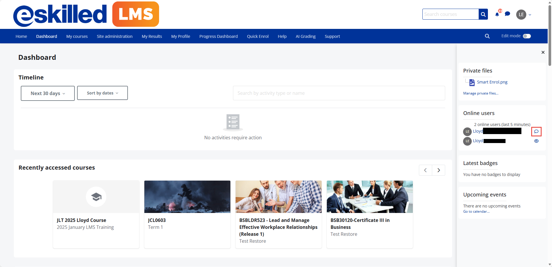 Option 3: Using the Dashboard → Online Users block and clicking the message icon next to an online user’s name: