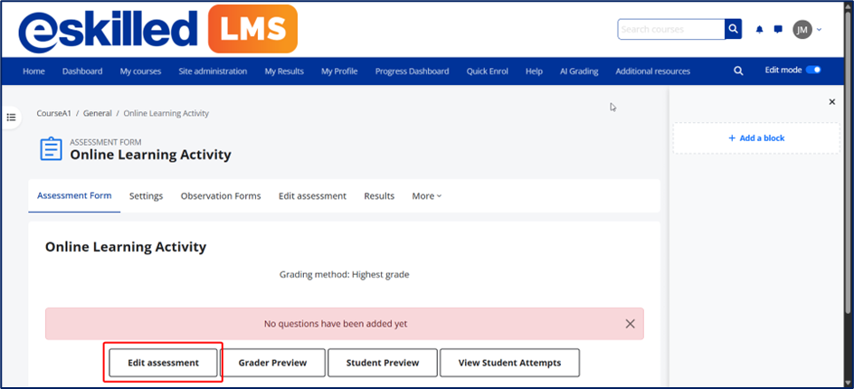 IMPORTANT: The assessment activity does not automatically save your progress and does not operate in a draft mode. To avoid losing any changes, it is recommended to click the Save button regularly while editing. This helps ensure that all updates are properly stored and prevents accidental loss of work due to unsaved changes.