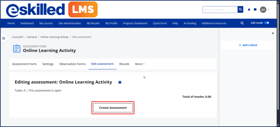 4. Once saved, you will be redirected to the assessment page. By default, the assessment is empty, as indicated on the page. Click the “Edit Assessment” button, then select “Create Assessment.”