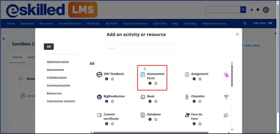 2. Select the Assessment Form activity, which is located at the top of the list.