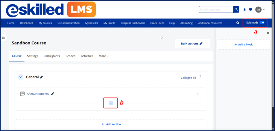 1. Open the course where you would like to add the activity. Once inside the course, enable editing mode, then click the plus icon to add an activity, and select “Add an activity or resource.”
