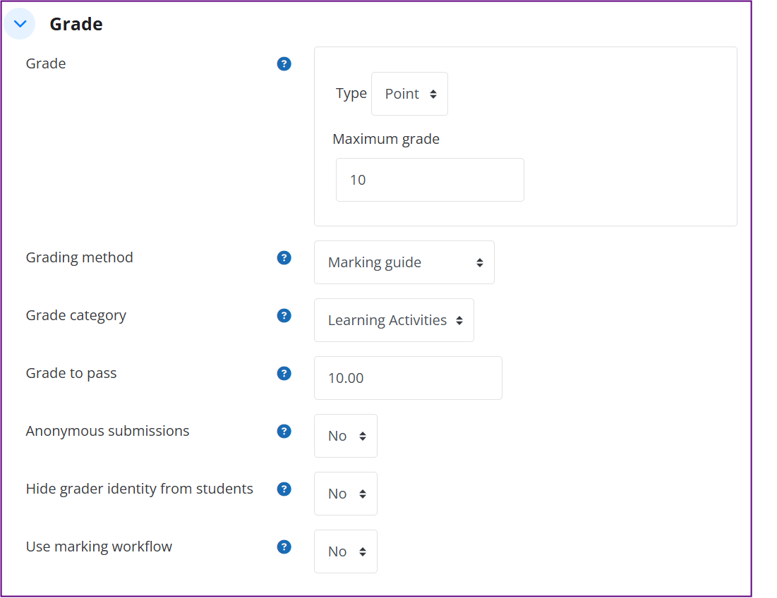 Use marking workflow | If enabled, marks will go through a series of workflow stages before being released to students. This allows for multiple rounds of marking and allows marks to be released to all students at the same time. |
