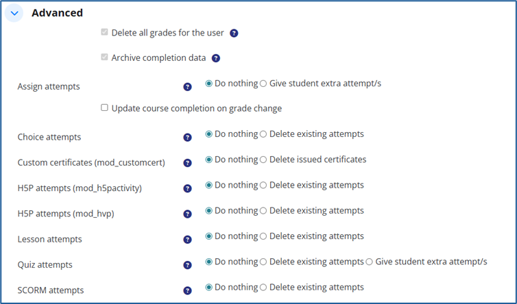 - Enrol method – Only users enrolled with selected enrol methods will be included in resetting completion data. If none selected, that means no restriction on enrolment method for users.