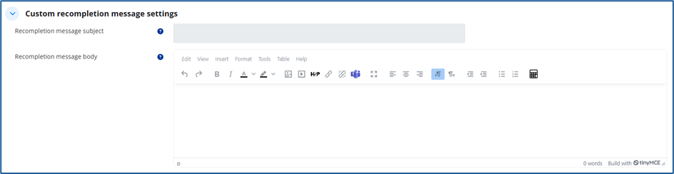 - Recompletion message body – A custom recompletion email body may be added using plain text or the text editor. The following placeholders may be included in the message: