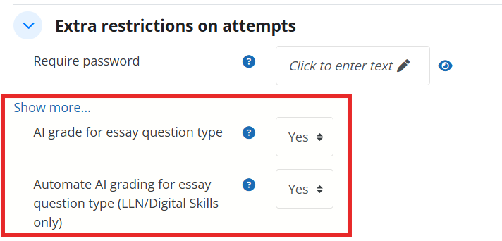 Step 3: Once “LLN Quiz” tick box is enabled, the LLN Quiz Settings options will be shown. adjust the level of benchmark for each LLN (The value configured here would represent the expected outcome for all learner and per question.)