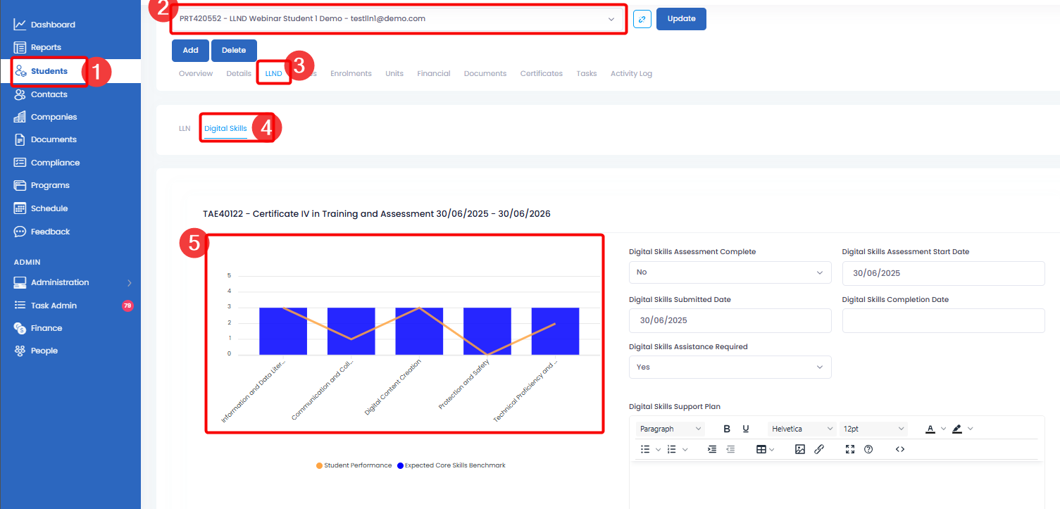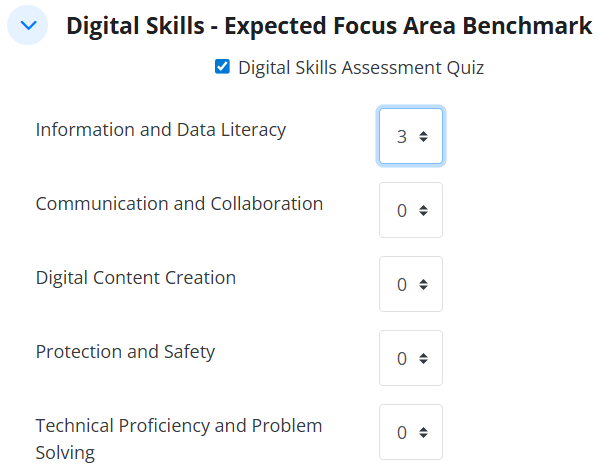 NOTE: The data in the Spiky Profile is based on the results of the student’s latest LLN attempt.Step 3: Once “Digital Skills Assessment Quiz” tick box is enabled, the Digital Skills Quiz Settings options will be shown. adjust the level of benchmark for each Digital Skills Assessment (The value configured here would represent the expected outcome for all learner and per question.)