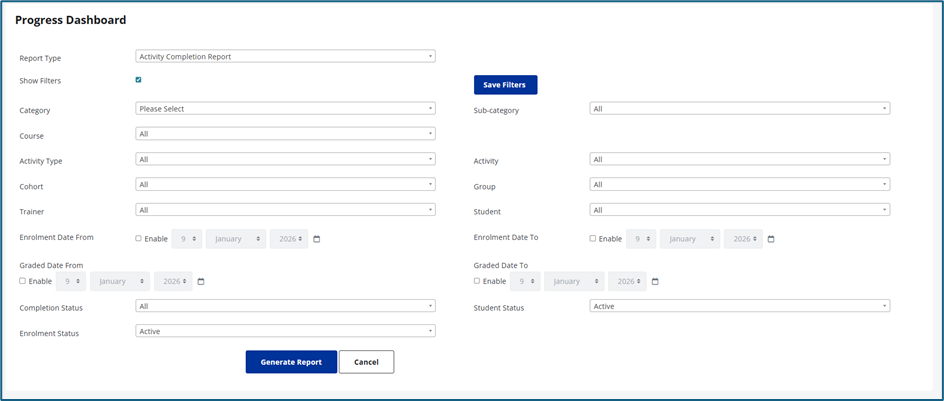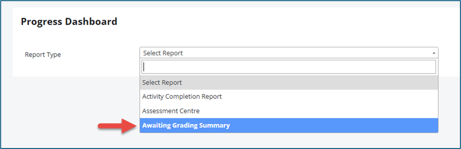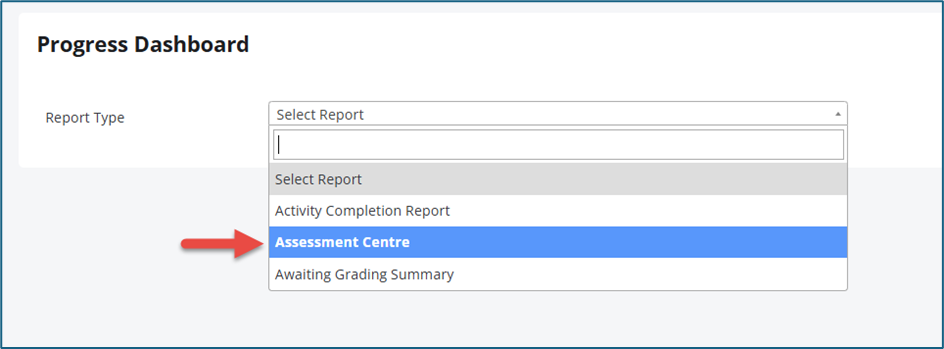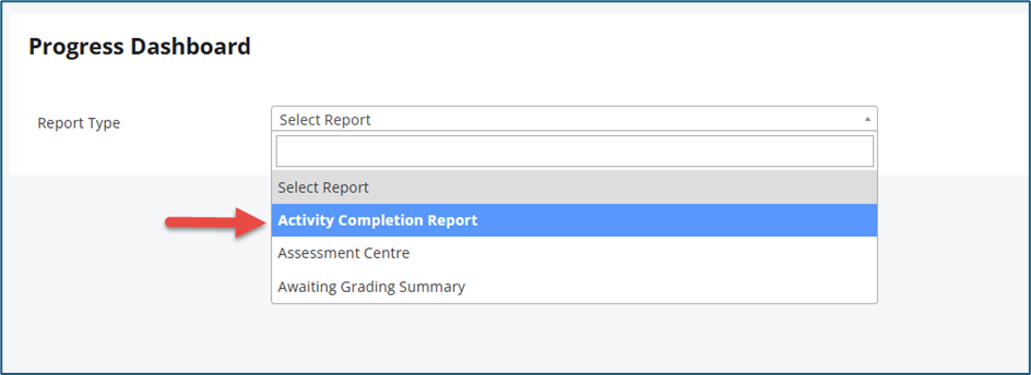 1. On the Progress Dashboard page, select the Report Type to Activity Completion Report.