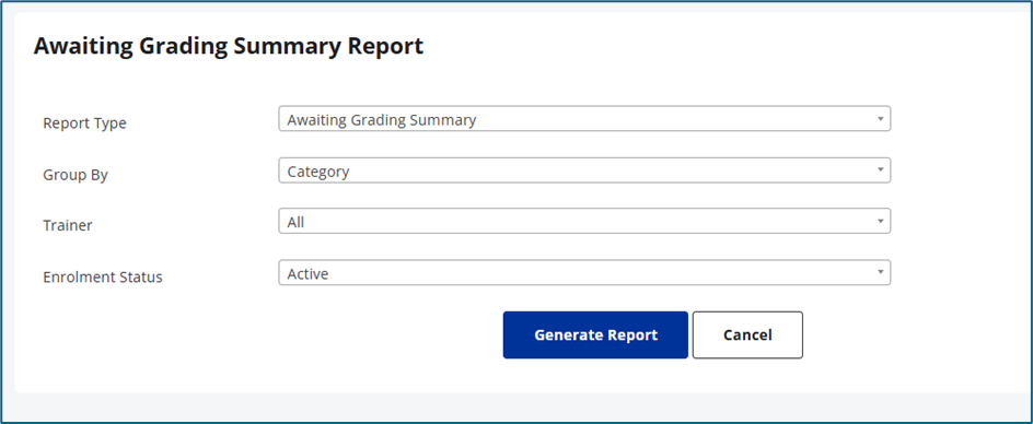 - Trainer – Use this filter to select all trainers or a specific trainer to view which courses and students they have graded. Trainers will only see records related to their own courses.