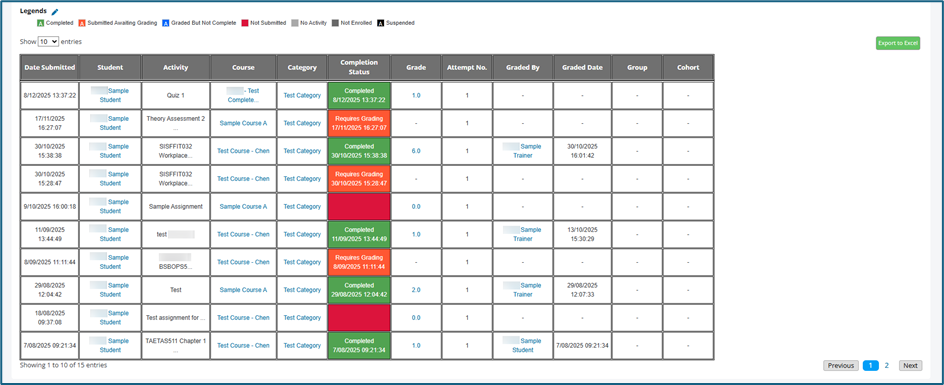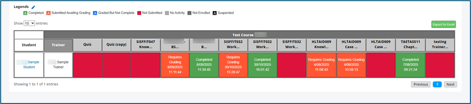 - Green (Completed/Graded) and Orange (Requires Grading) Statuses – These are clickable and will redirect you to the exact activity in a new tab. This is especially useful for trainers, as it allows them to quickly access and grade student activities.