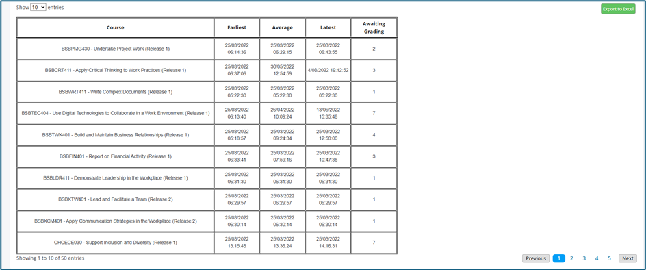 - Submitted, Awaiting Grading – Includes courses that have been submitted but not yet graded